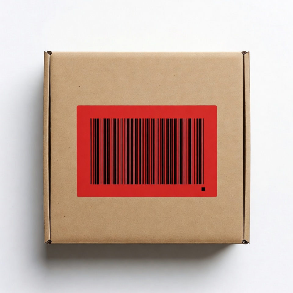 A brown cardboard box sits on a plain surface. A red barcode label is attached to the front, facing upward.