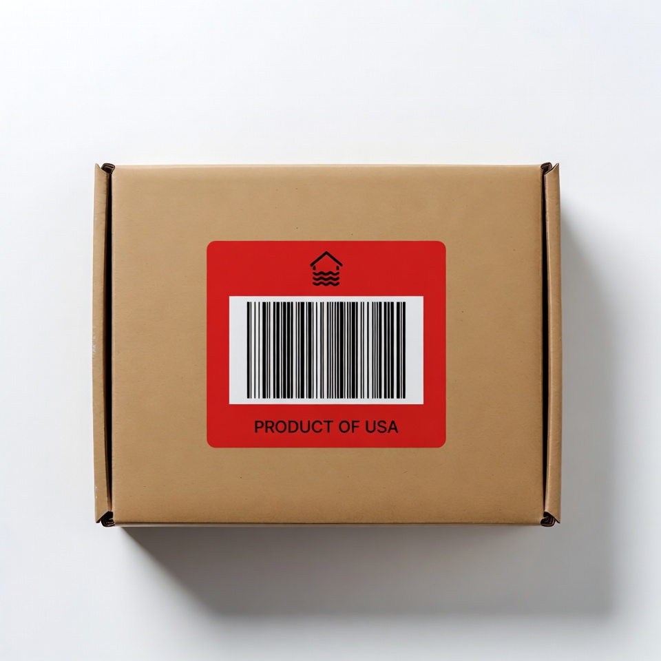 A cardboard package is shown with a red label and barcode. The package indicates it is from the USA and is ready for shipping.