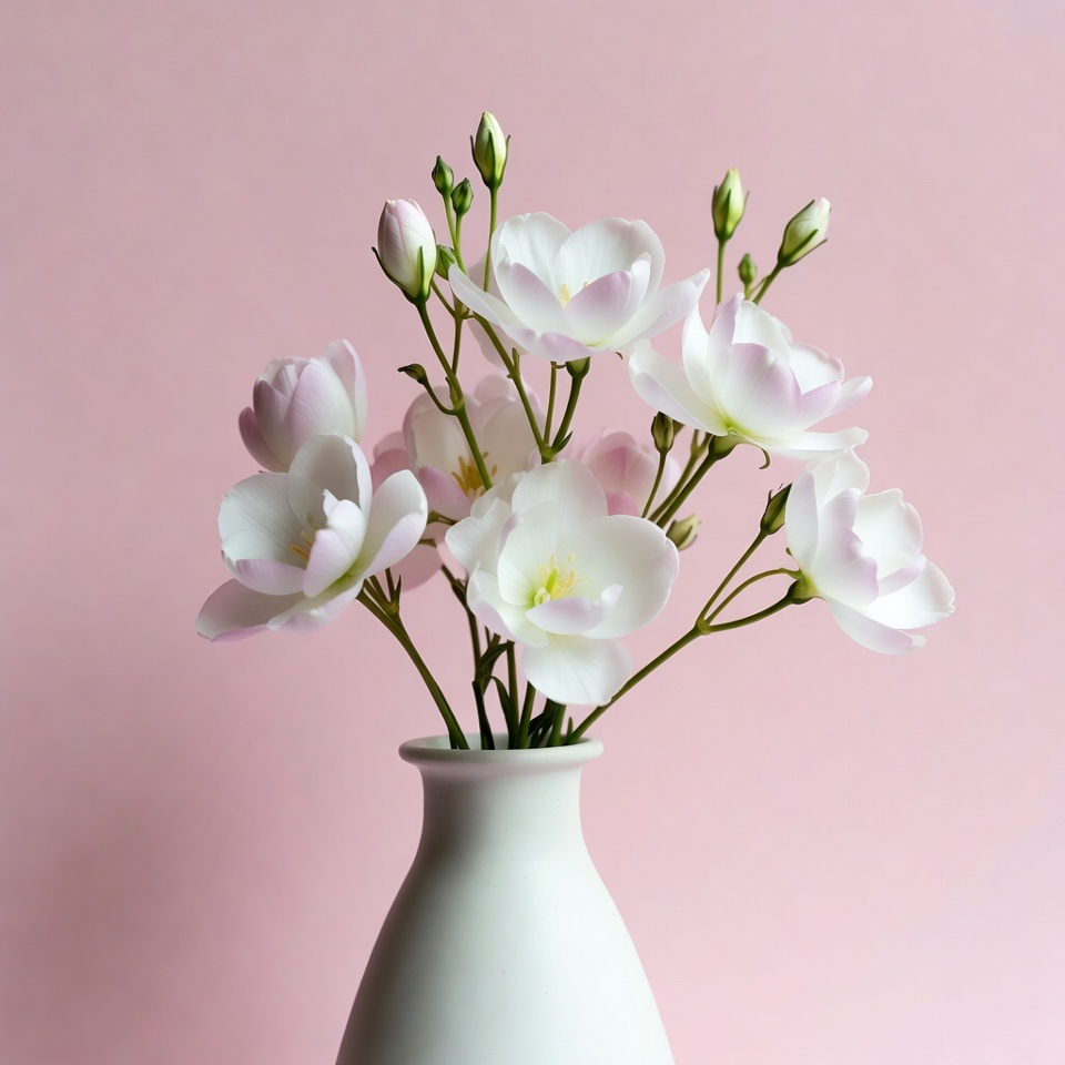 A white vase holds fresh flowers with pink and white petals. The arrangement stands against a soft pink backdrop, highlighting the colors.