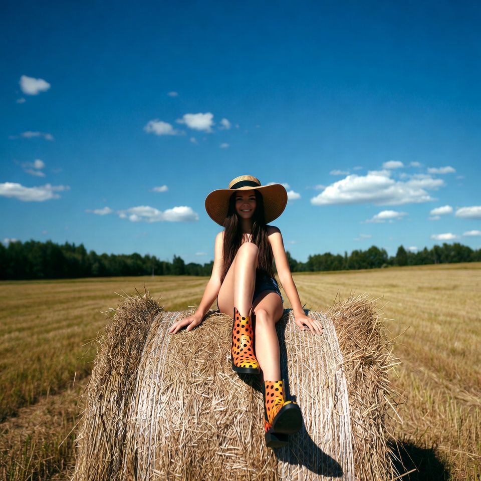A young woman sits on a hay bale in a field. She wears a large hat and bright boots under a clear blue sky with clouds.