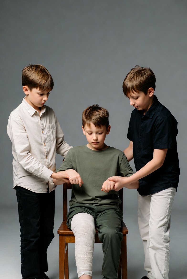 Three boys assist a friend sitting in a chair, showing teamwork and care in a studio setting with a plain background.