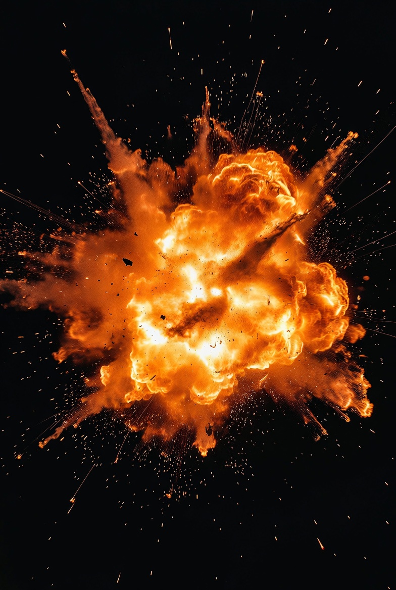 Fire and debris erupt during a large explosion, creating a bright display against a dark background with smoke rising in all directions.