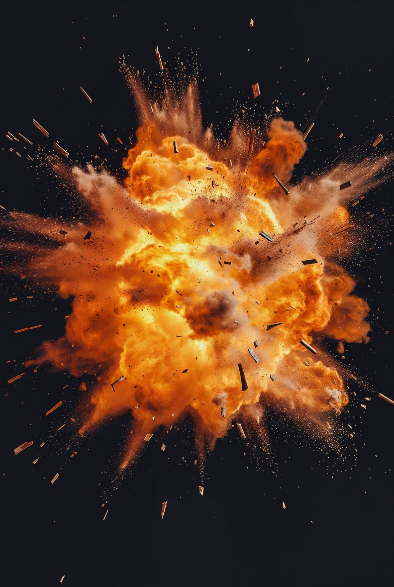 A large explosion occurs in a dark background, sending up fire, smoke, and debris as it expands rapidly. The scene captures chaos and energy.