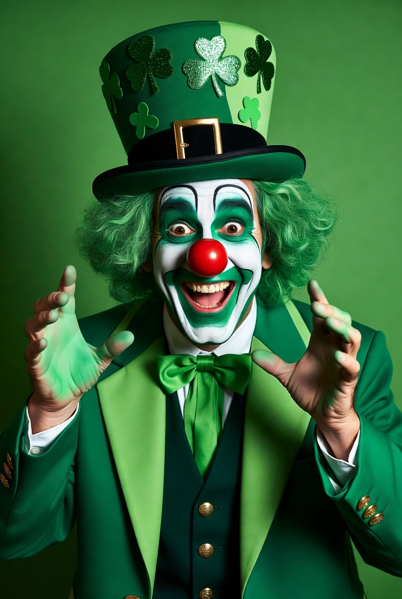 A clown with white face paint and green costume stands against a green background. The clown smiles widely and gestures playfully.