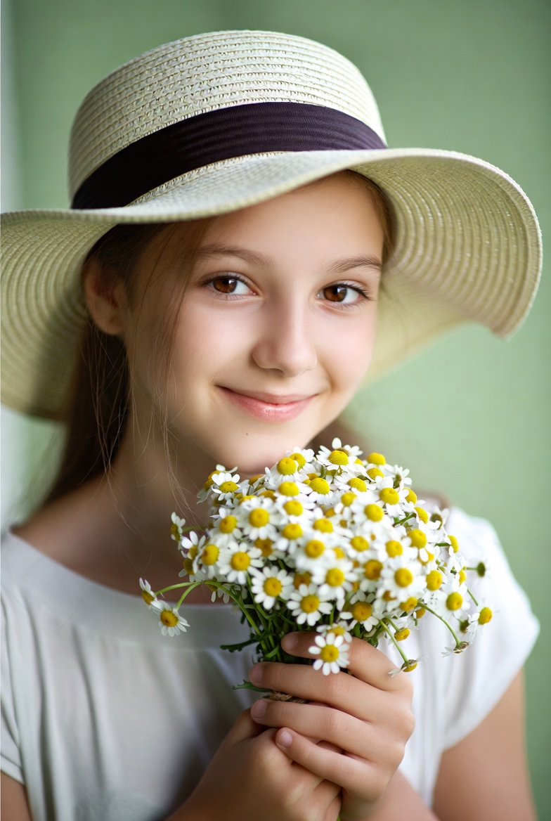 Girl holding flowers in a hat