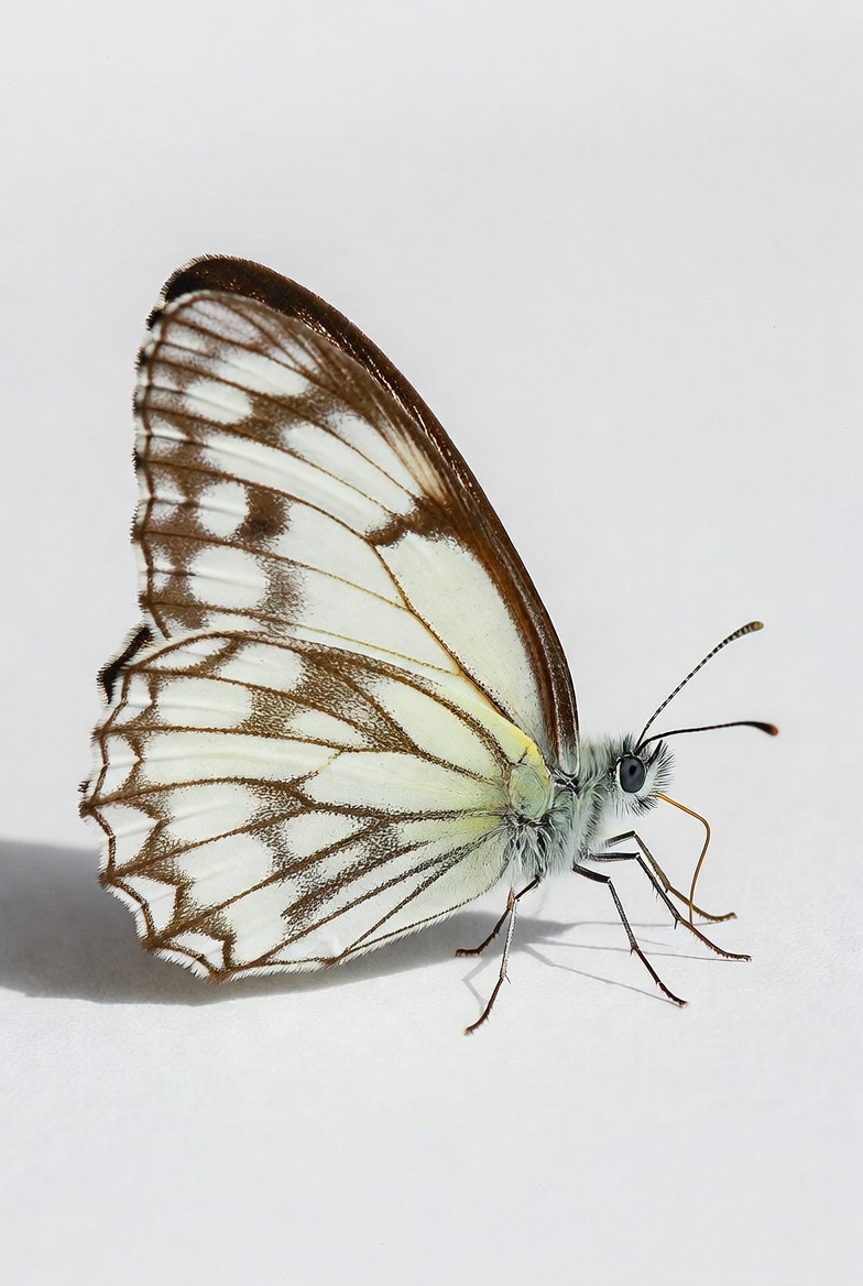 A butterfly with white and brown wings is resting on a smooth surface. Its delicate features are visible in the light.