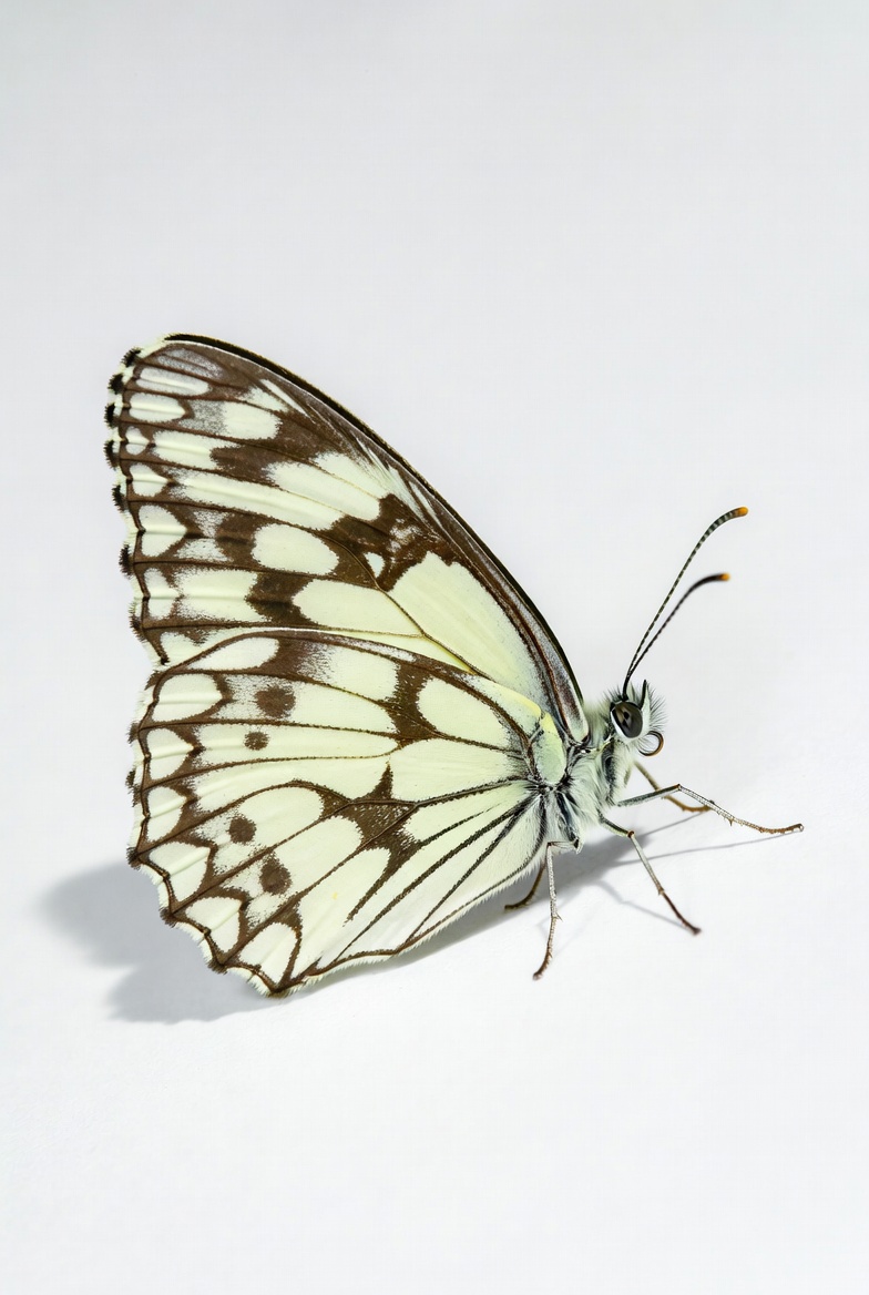 A butterfly rests on a plain white background. Its wings are open, showing patterns and colors. This scene captures the delicate beauty of nature.