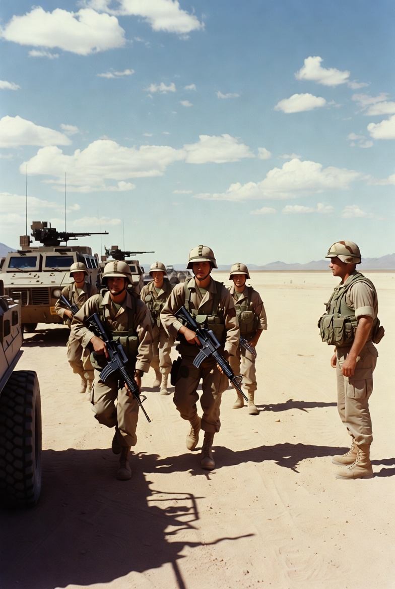 Soldiers in military gear carry rifles while walking in the desert during a training exercise under a clear sky with clouds.