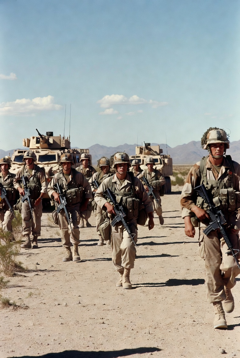 Soldiers march across desert landscape