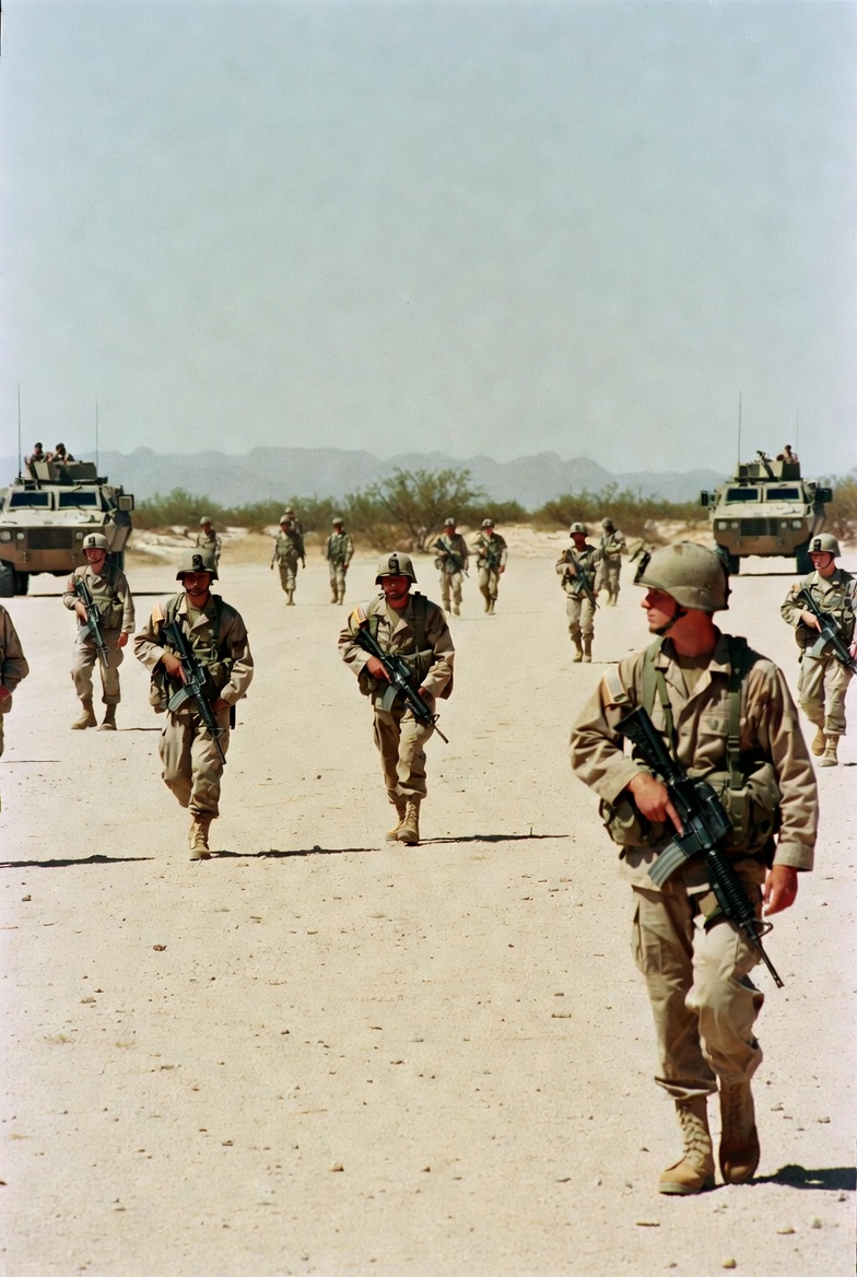 Group of soldiers walks in a desert area, carrying rifles and wearing military uniforms. Vehicles are parked in the background under clear skies.