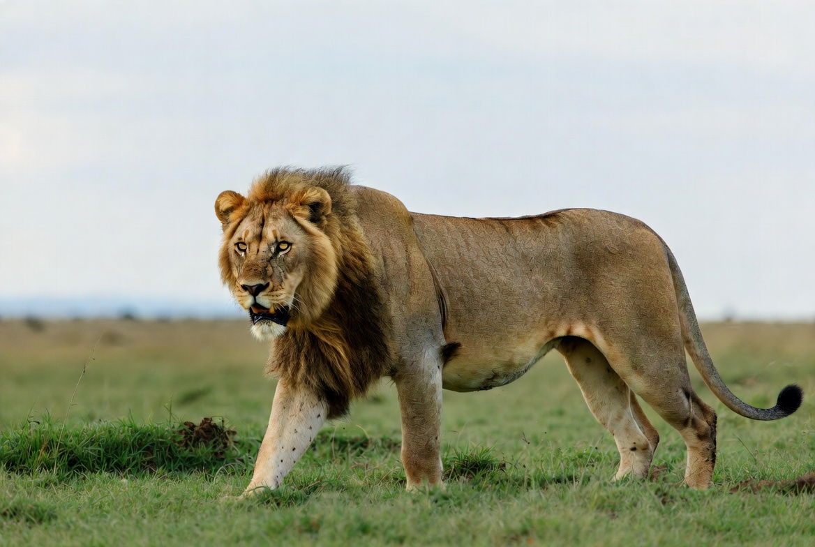 Lion walks across grassy plain