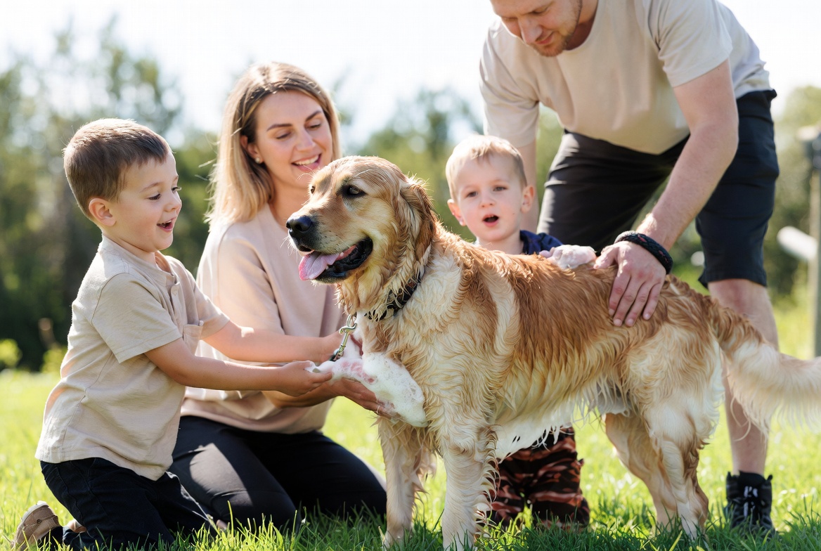 activity, bonding, children, dog, family, field, fun, golden retriever, grass, happiness, nature, outdoors, parents, pet, play, smiling, summer, sunny, together, wash