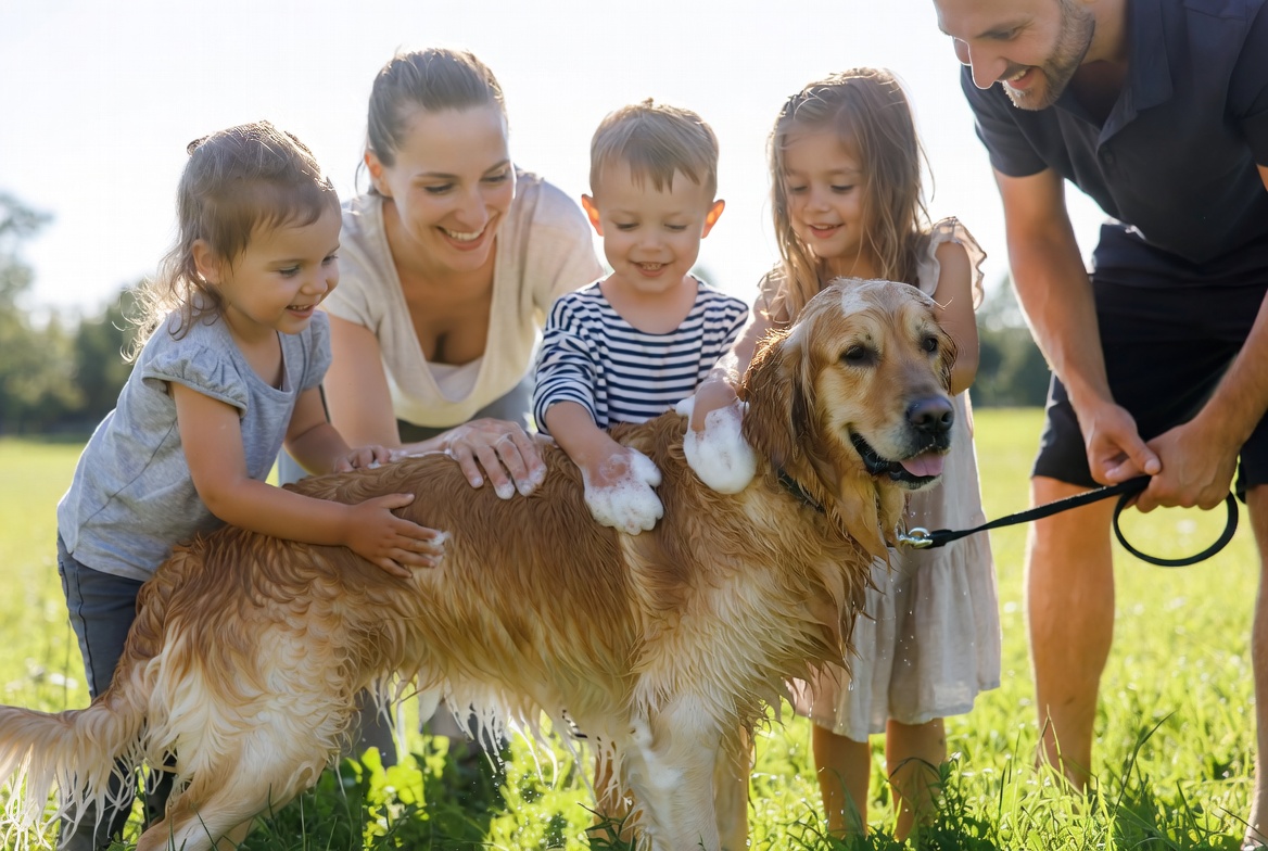 activity, afternoon, bond, children, dog, family, fun, golden retriever, grass, joy, leisure, love, nature, outdoor, park, pet care, playtime, smiles, soap, washing