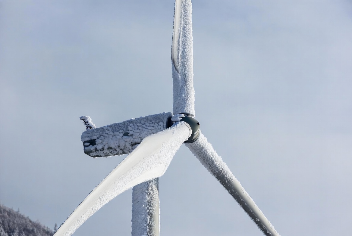 A wind turbine stands in a snowy area with ice covering its blades. The scene shows a cold and wintery environment.
