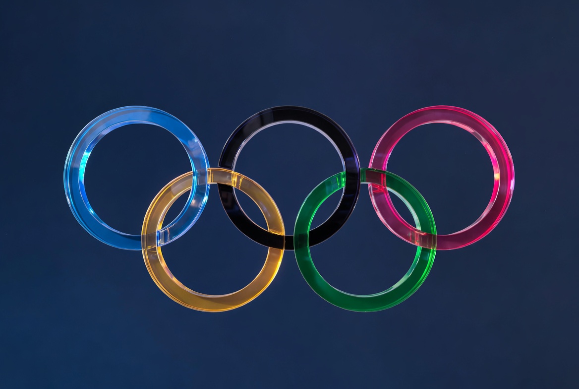Five colorful rings are arranged on a dark background. They represent the Olympic Games and symbolize unity in sports.