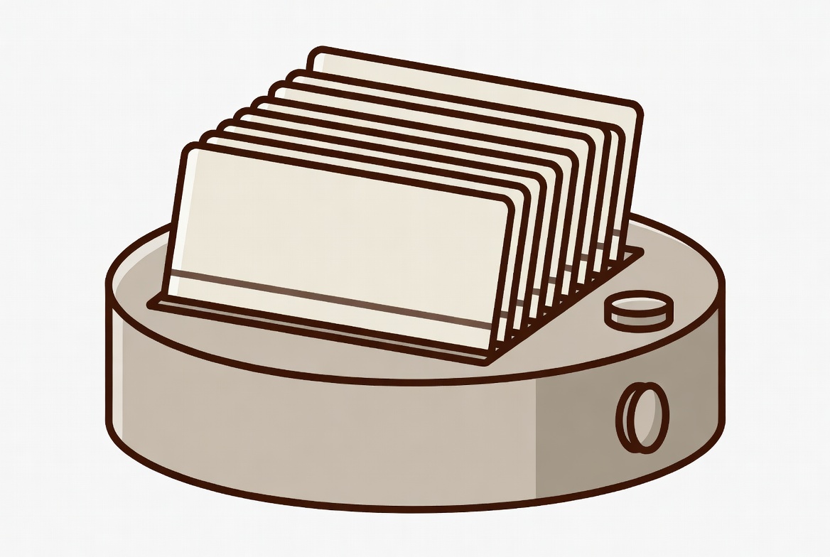 A simple card holder stands on a round base. The holder has several slots for cards. The design is plain and functional in appearance.