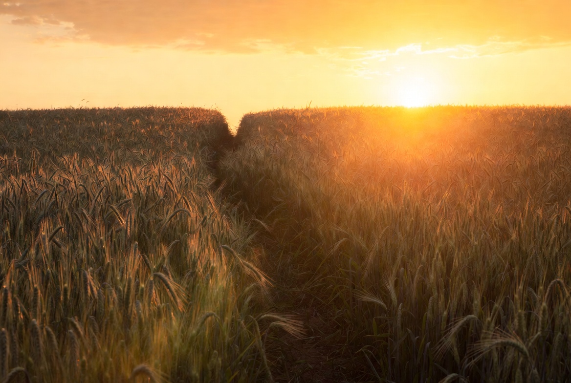 Wheat field stretches under a golden sunset with a pathway cutting through the plants. The sky glows as the day ends, showcasing nature.