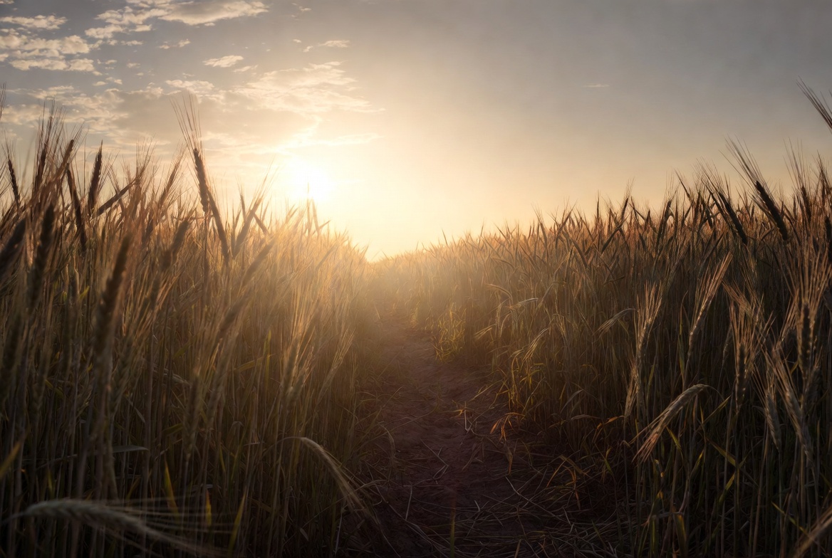 agriculture, clouds, crops, earth, evening, farming, field, growth, harvest, horizon, landscape, nature, outdoors, pathway, plants, rural, sky, sunlight, sunset, wheat
