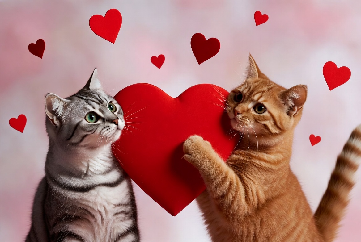Two cats are holding a large heart shape between them. Red hearts float above them. The setting is cheerful and festive.