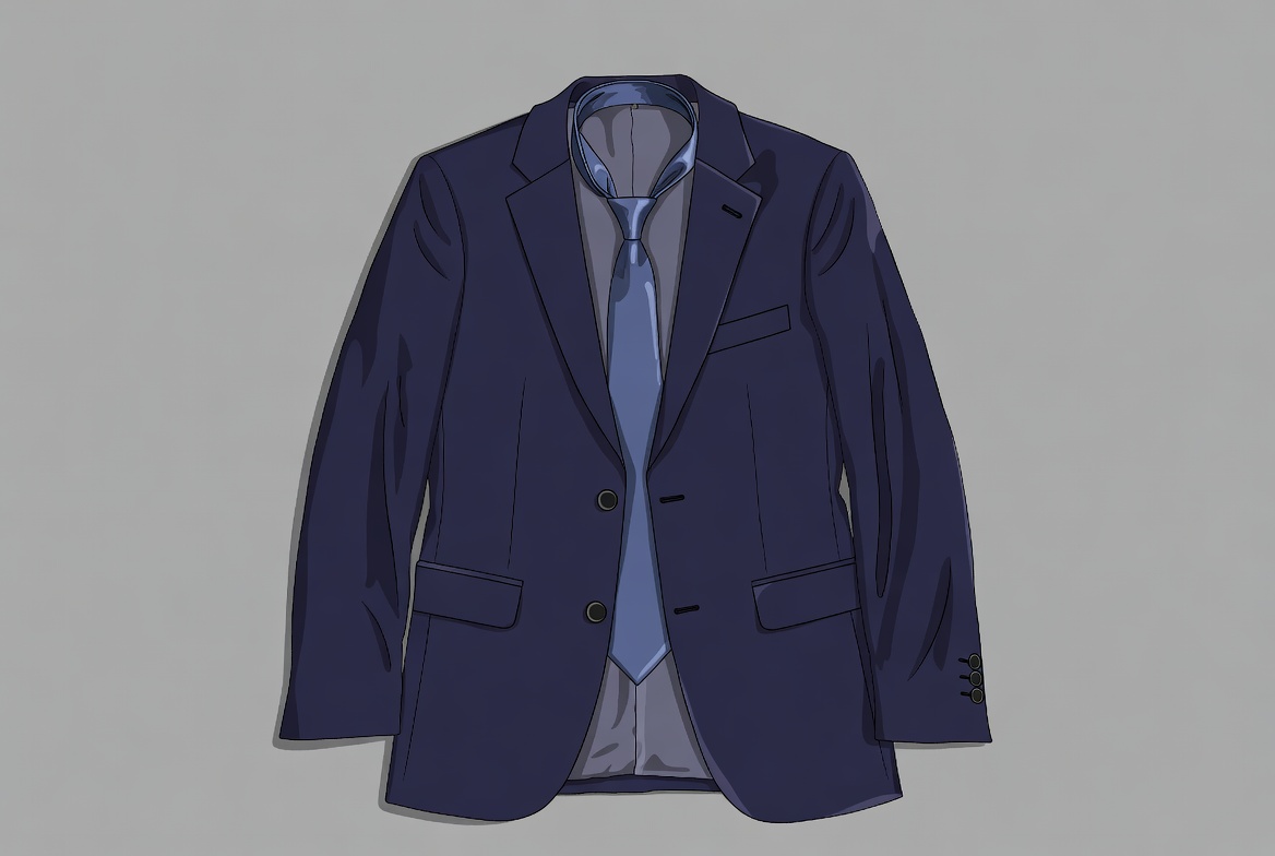 A navy suit jacket and light tie are laid flat against a gray background. The suit captures a formal style for various occasions.