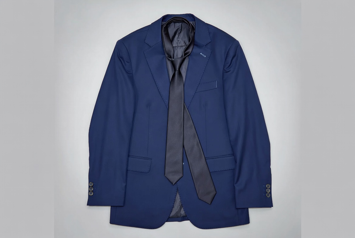 A navy suit jacket is laid flat with a matching gray tie draped over the collar area on a light background.