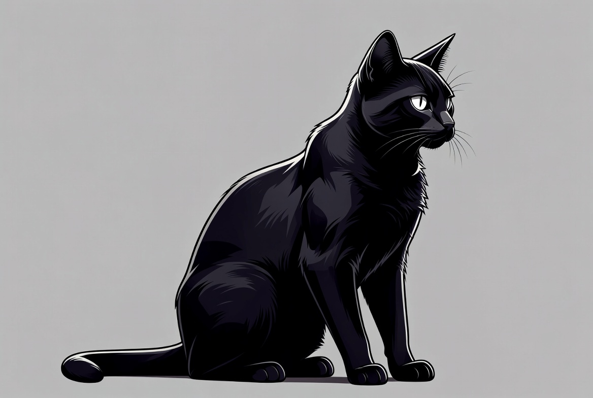 A black cat sits with its back straight, looking towards the right side. Its fur is glossy and the setting is simple and plain.