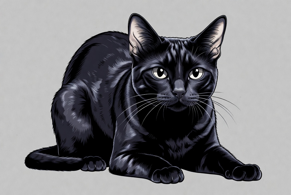 alertness, animal, black cat, calm, companionship, cute, domestic, ears, eyes, feline, fur, grey background, laying down, nature, observing, paws, pet, relaxing, watching, whiskers