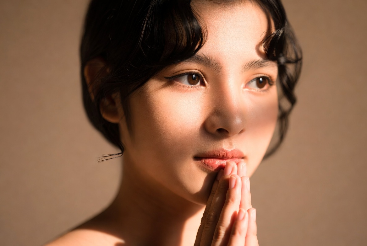 A woman is standing with her hands pressed together. Light shines on her face, creating a soft shadow, conveying a moment of reflection.