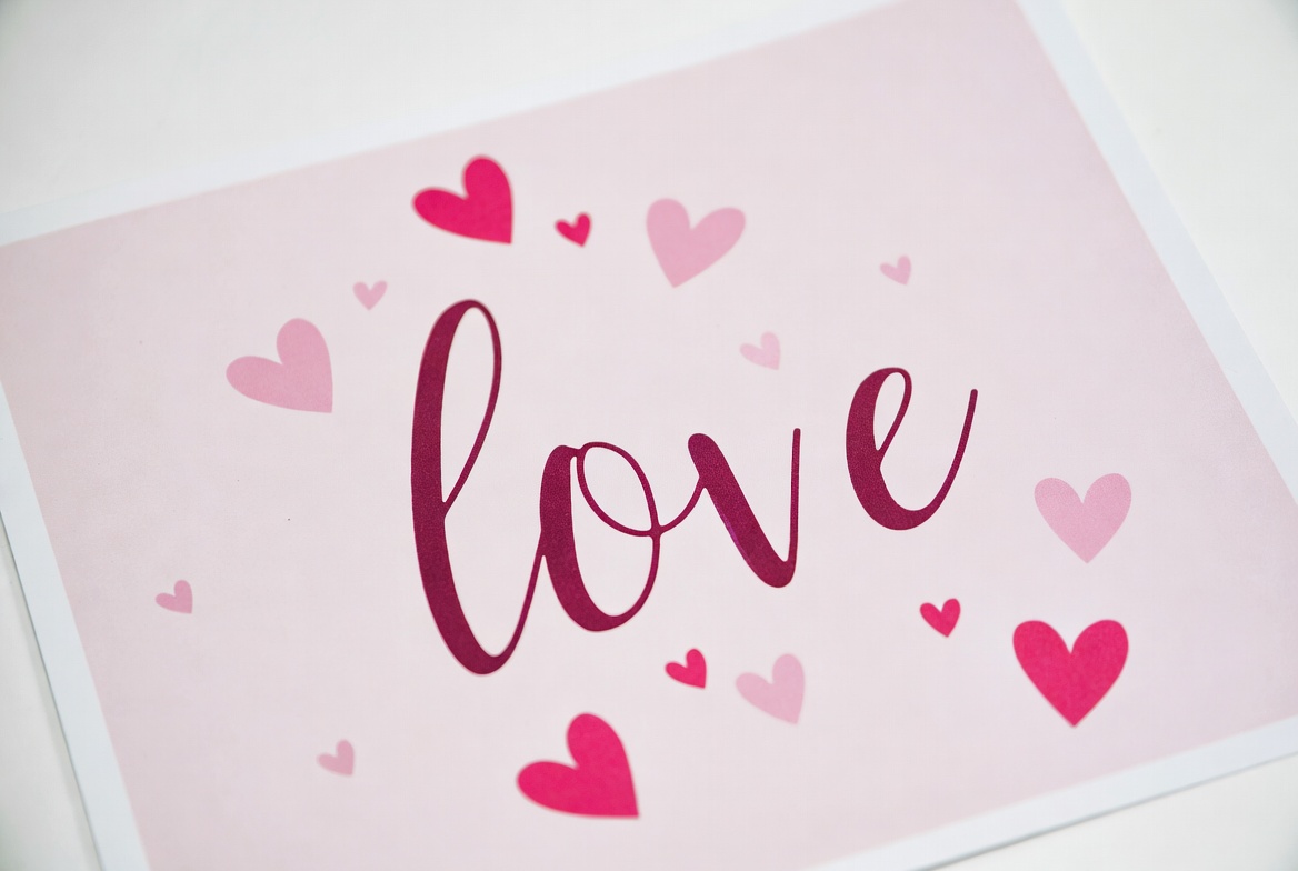 The design features the word love in the center surrounded by pink hearts on a light background. It is a simple and colorful graphic.
