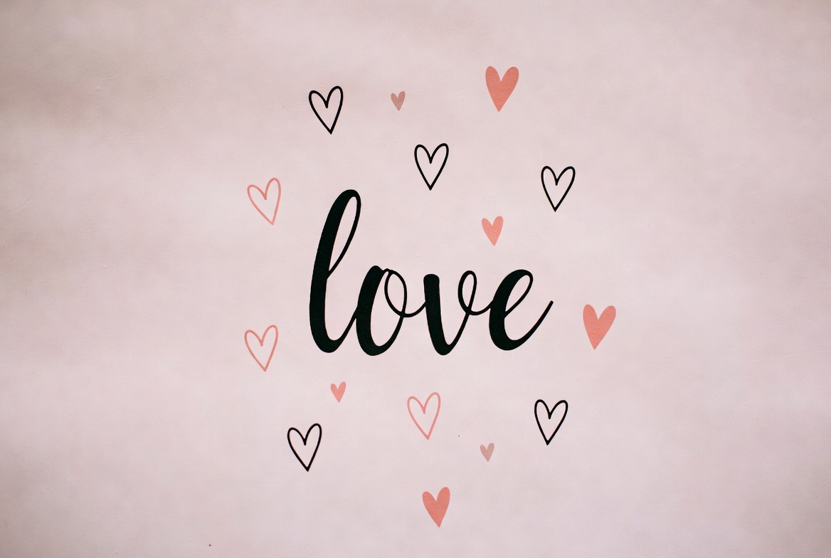 A simple design shows the word love in black script, surrounded by small hearts. The background color is soft pink.