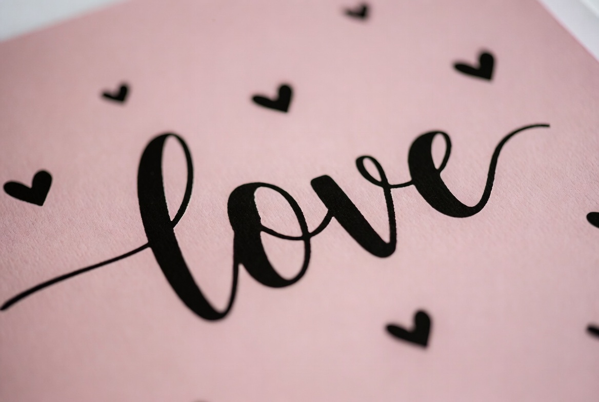 affection, artistry, card design, celebration, creativity, decor, emotions, feelings, gift, greeting card, hand lettering, hearts, illustration, love, pink background, printed art, romance, simple design, typography, wall art