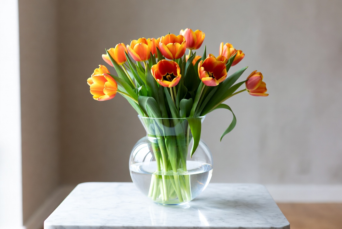 arrangement, blooming, bouquet, decoration, display, flowers, home, interior, nature, orange, petals, plant, room, spring, stems, still life, table, tulips, vase, water