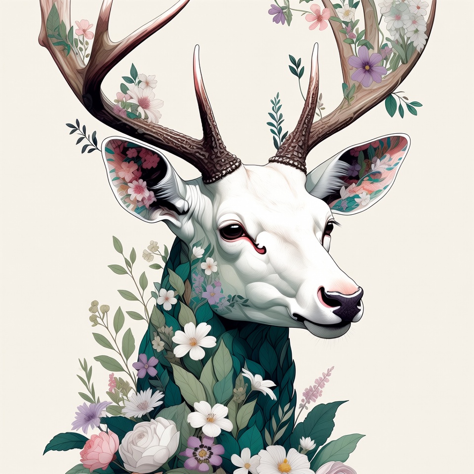 A deer with large antlers is surrounded by colorful flowers. The artwork features a blend of nature and creativity.