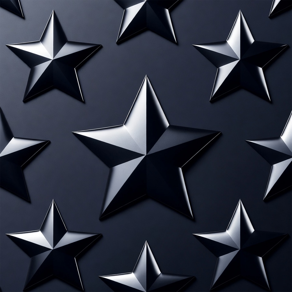 Shiny black stars are evenly spaced on a dark surface. The design creates a bold visual effect that captures attention.