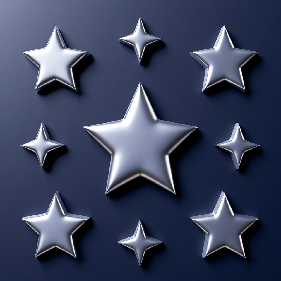 Metal stars are arranged randomly on a solid dark surface. The design shows different sizes and shapes of stars in silver.