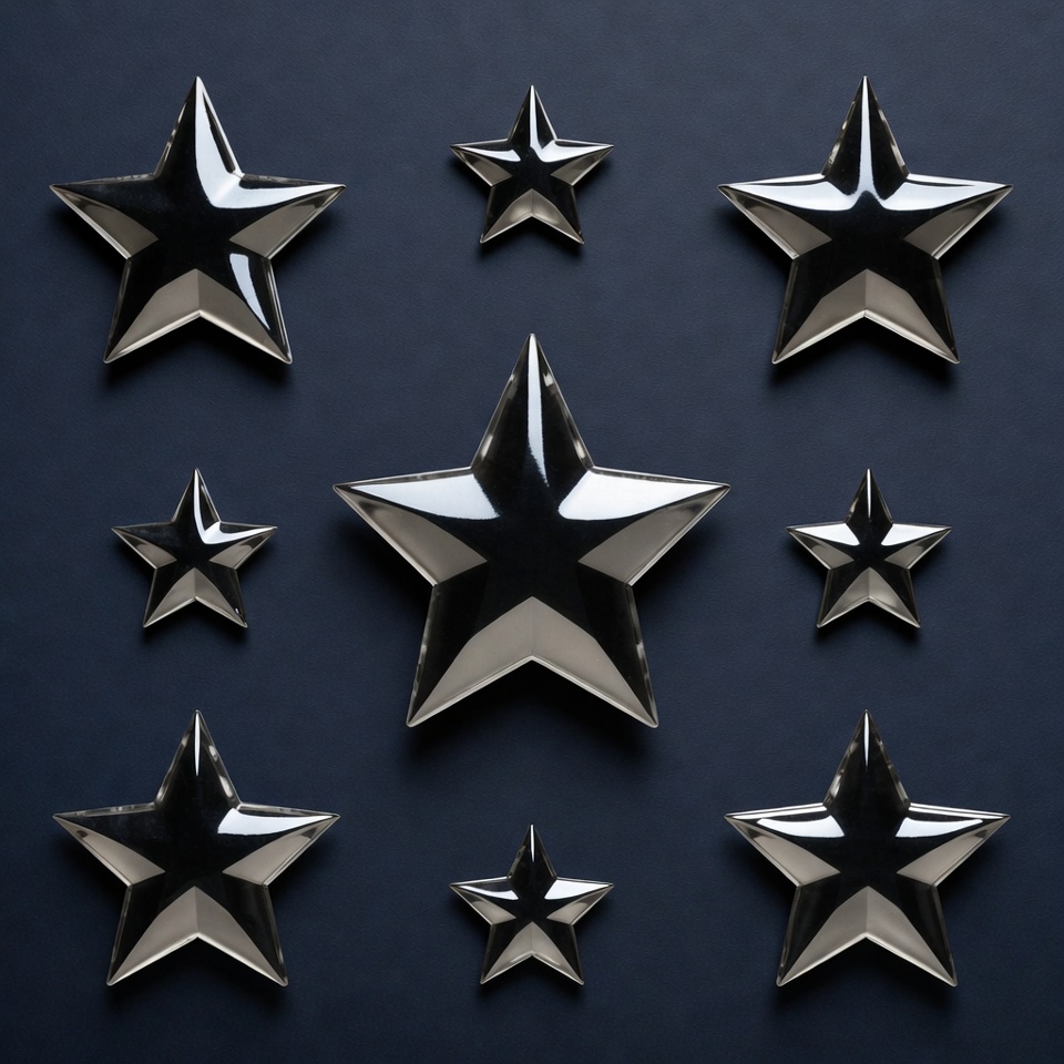 Several silver stars are arranged in different sizes on a dark surface. The stars have a shiny finish and create an interesting design.