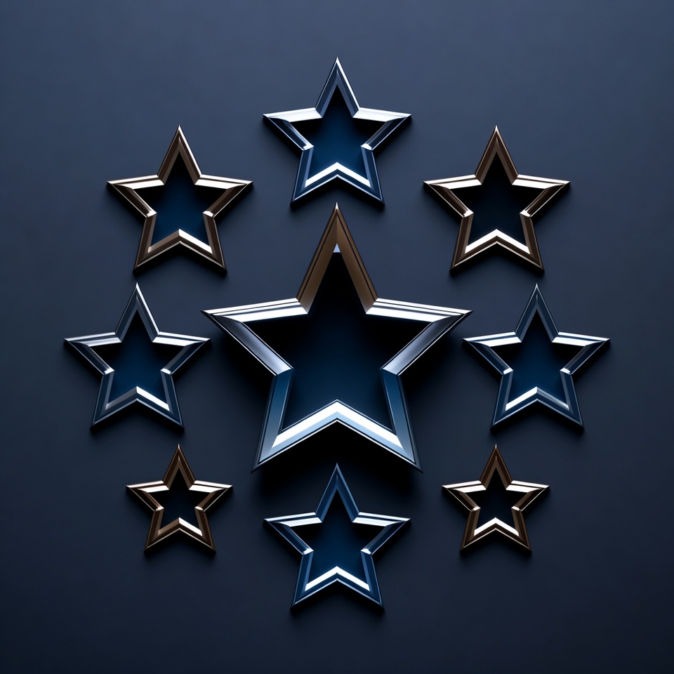 Several metal star shapes are arranged in a pattern on a dark background. The stars are of different sizes and colors.