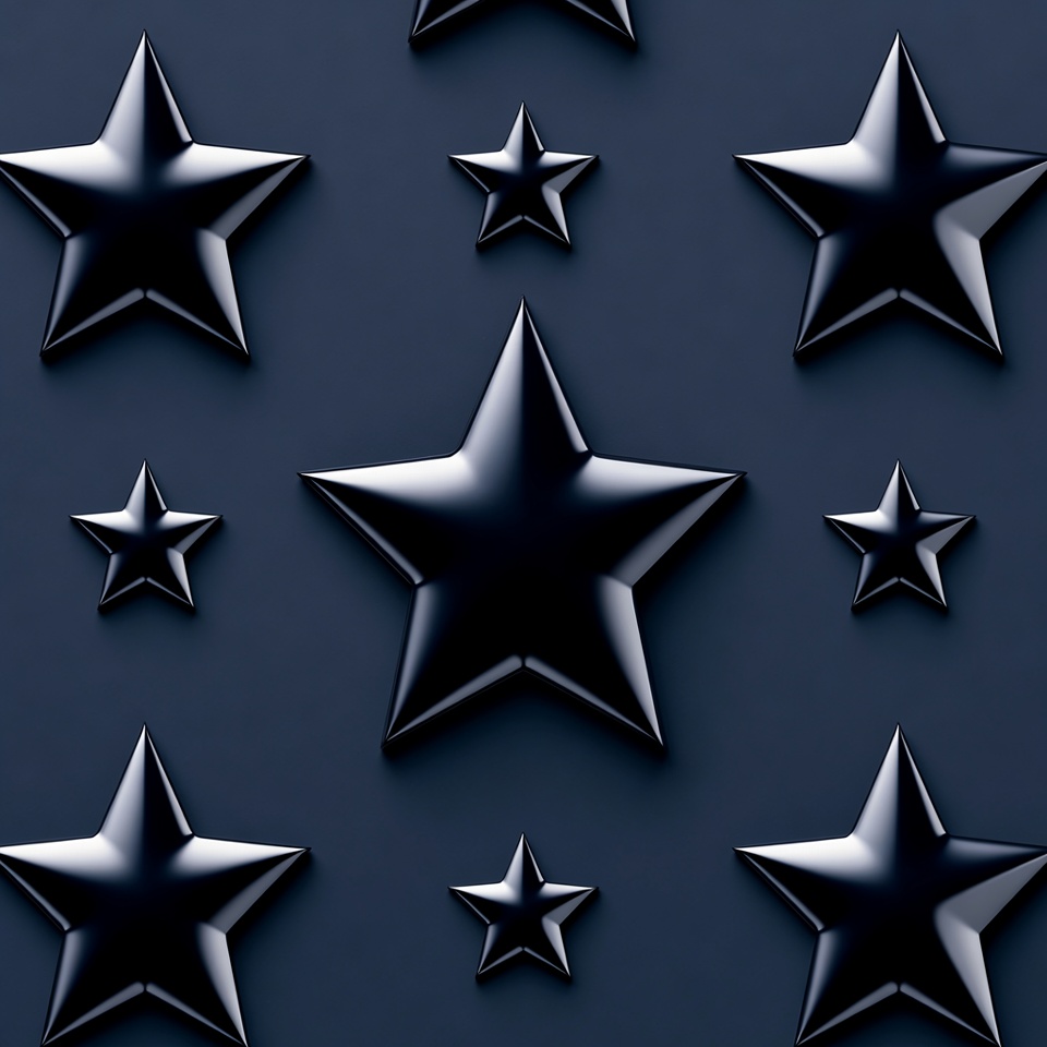 Decorative stars of various sizes are arranged on a dark background, creating a striking visual effect. The stars appear glossy and three-dimensional.