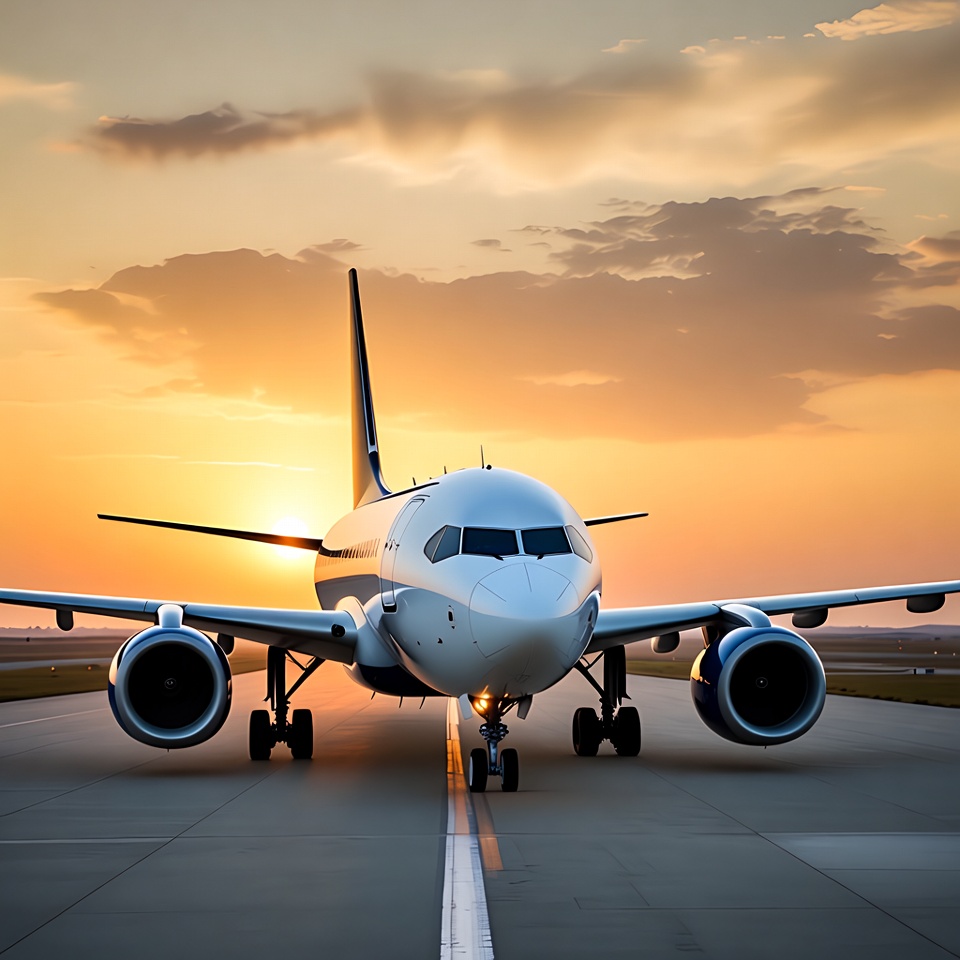A plane is on the runway ready to take off as the sun sets in the background, casting a warm glow over the scene.