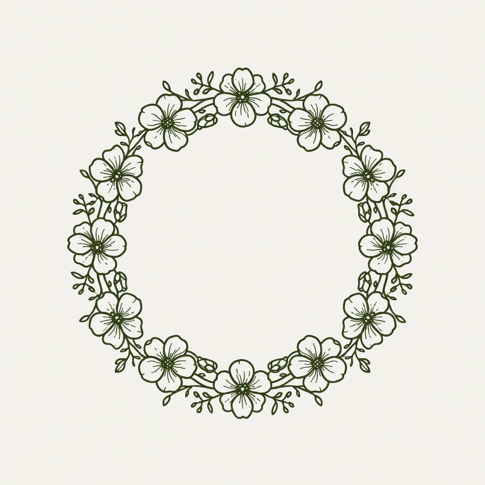 art, beauty, botanical, circle, craft, decoration, design, elegance, floral, flowers, graphics, green, leaves, nature, outline, pattern, plant, simple, symmetrical, wreath