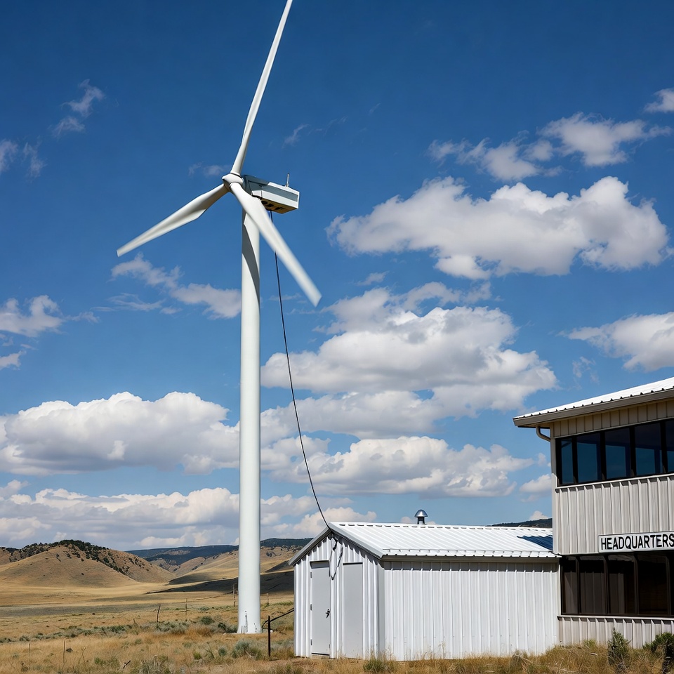 A wind turbine stands next to a white office building in a rural area under a blue sky with clouds. The structure is surrounded by open land.