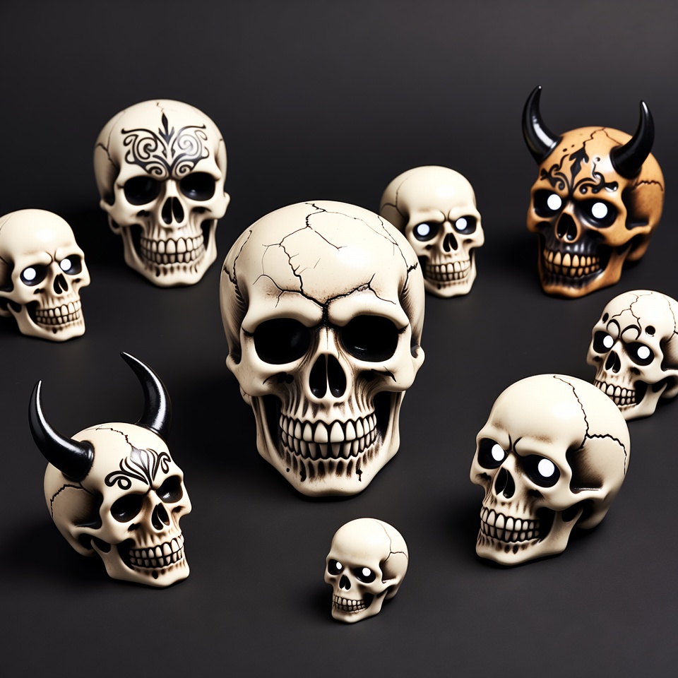 Various decorative skulls arranged on a dark surface. Each skull has different designs and features, creating a unique collection.