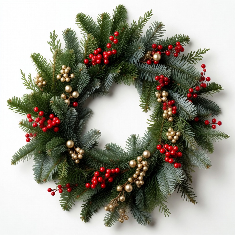 A circular wreath made of green foliage with red berries and gold accents, commonly used for holiday decoration.