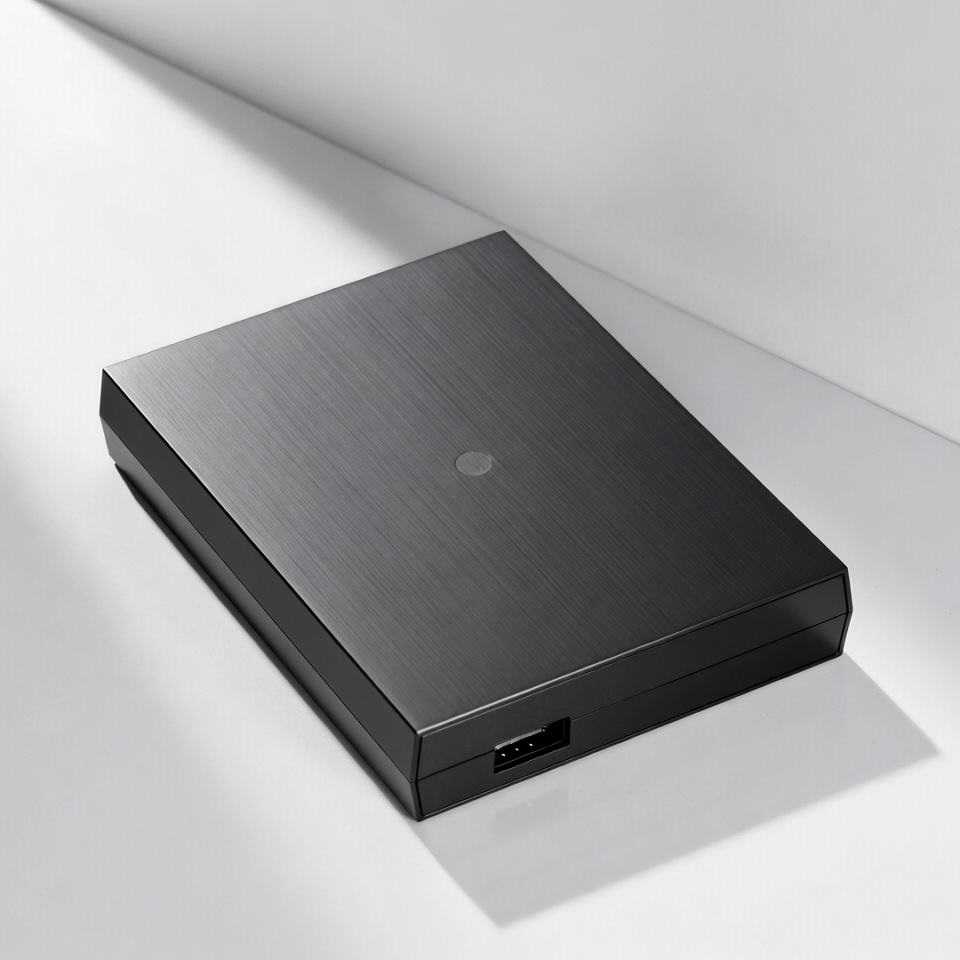 A black external storage device is displayed on a bright white surface. The device shows a USB port and a sleek design.