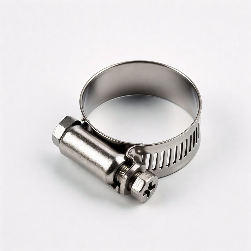 A metal hose clamp rests on a plain white background. The clamp shows a threaded bolt and a slot for tightening.