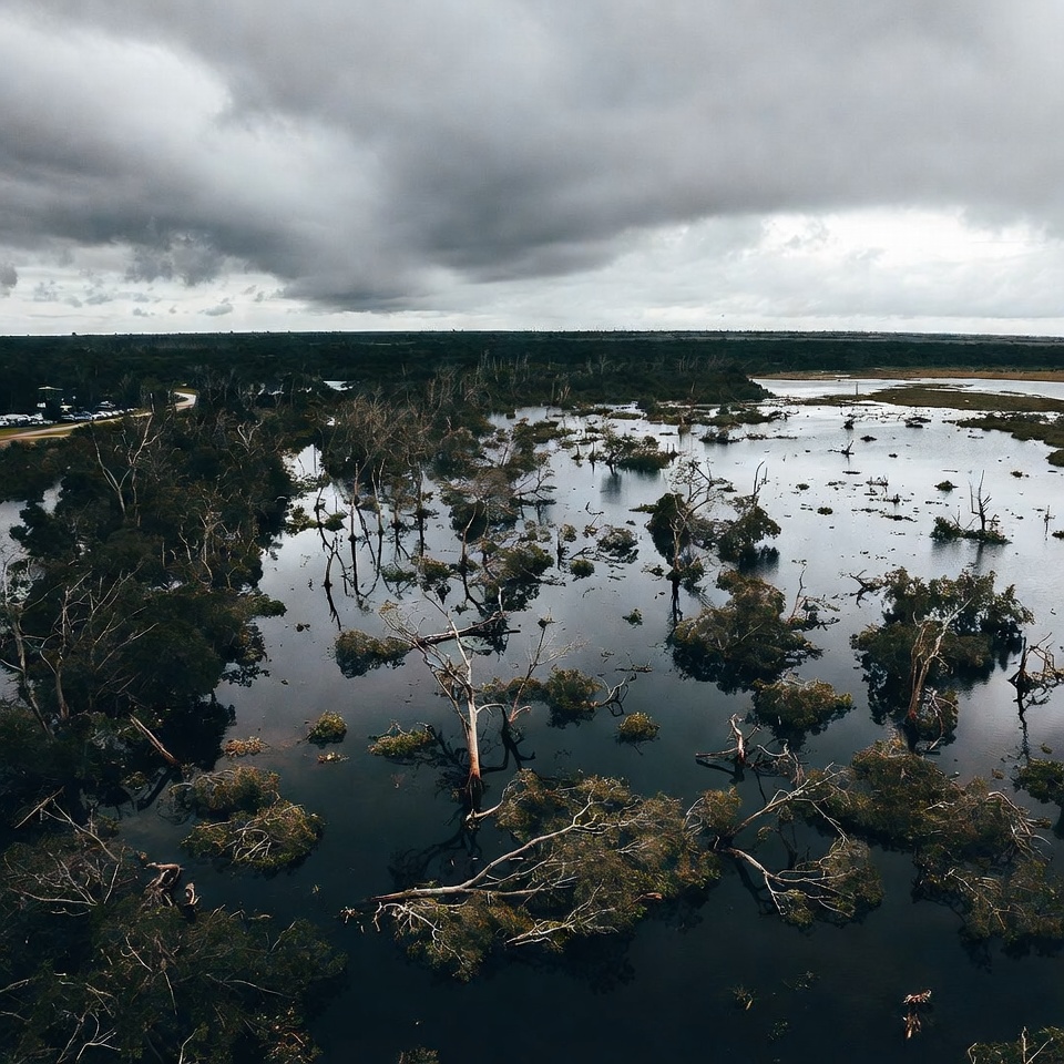 Water covers a wetland with dead trees visible. Dark clouds loom over the scene. Nature shows signs of flooding and erosion.