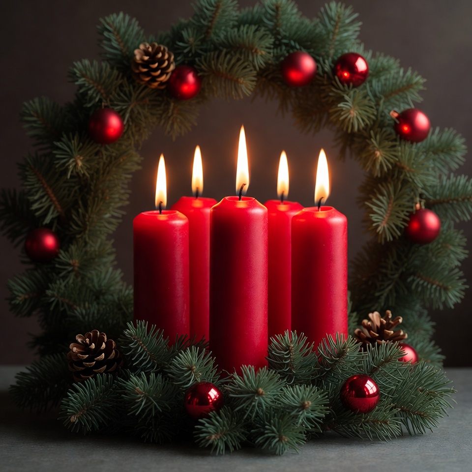 Five red candles burn brightly within a green wreath decorated with pinecones and ornaments. This scene captures a festive holiday atmosphere.