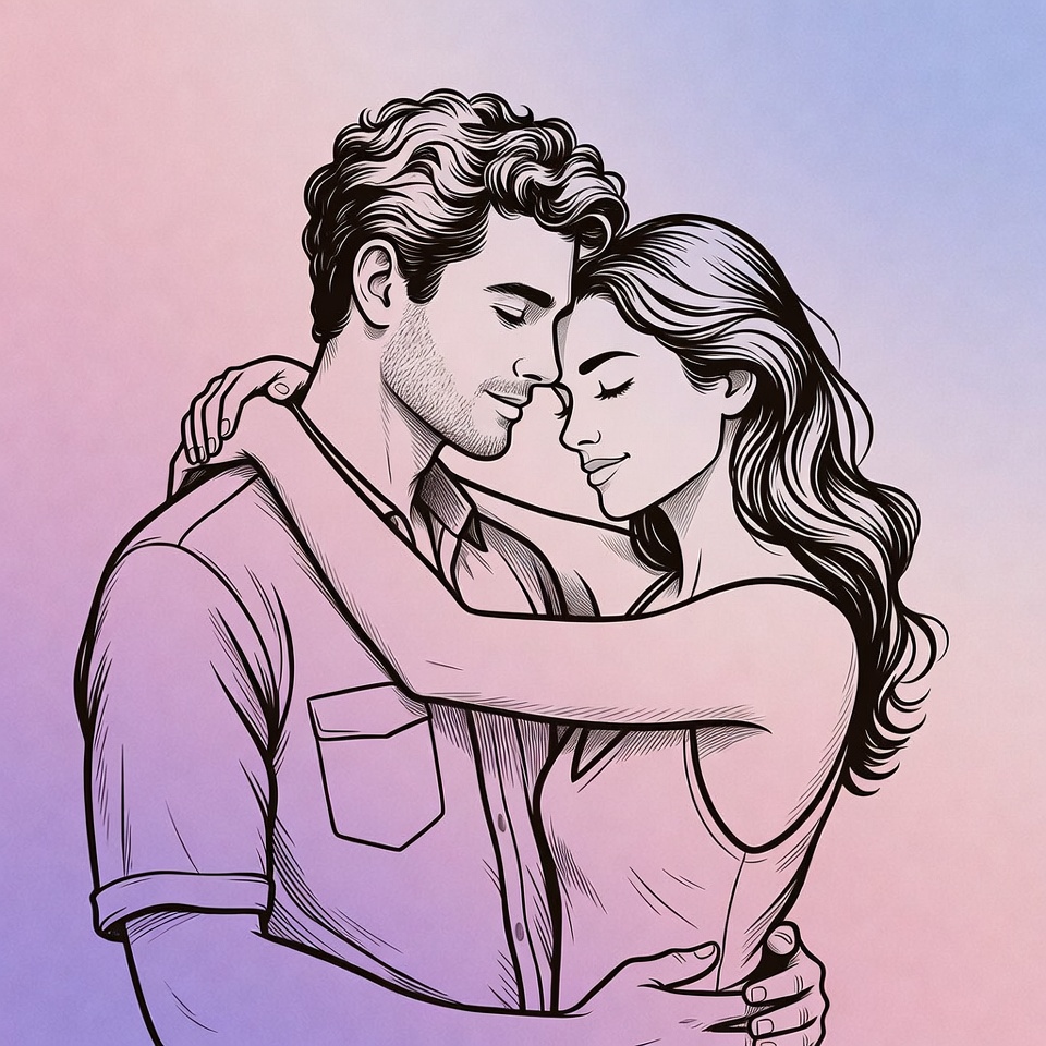A couple stands close, embracing each other while enjoying a quiet moment. Their eyes are closed, and they appear content and connected.