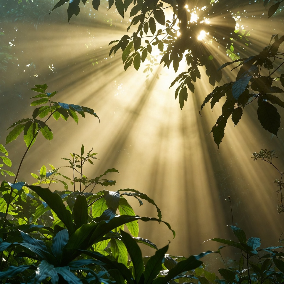 Sunlight breaks through the trees in a forest, creating beams that illuminate the surrounding plants and foliage.