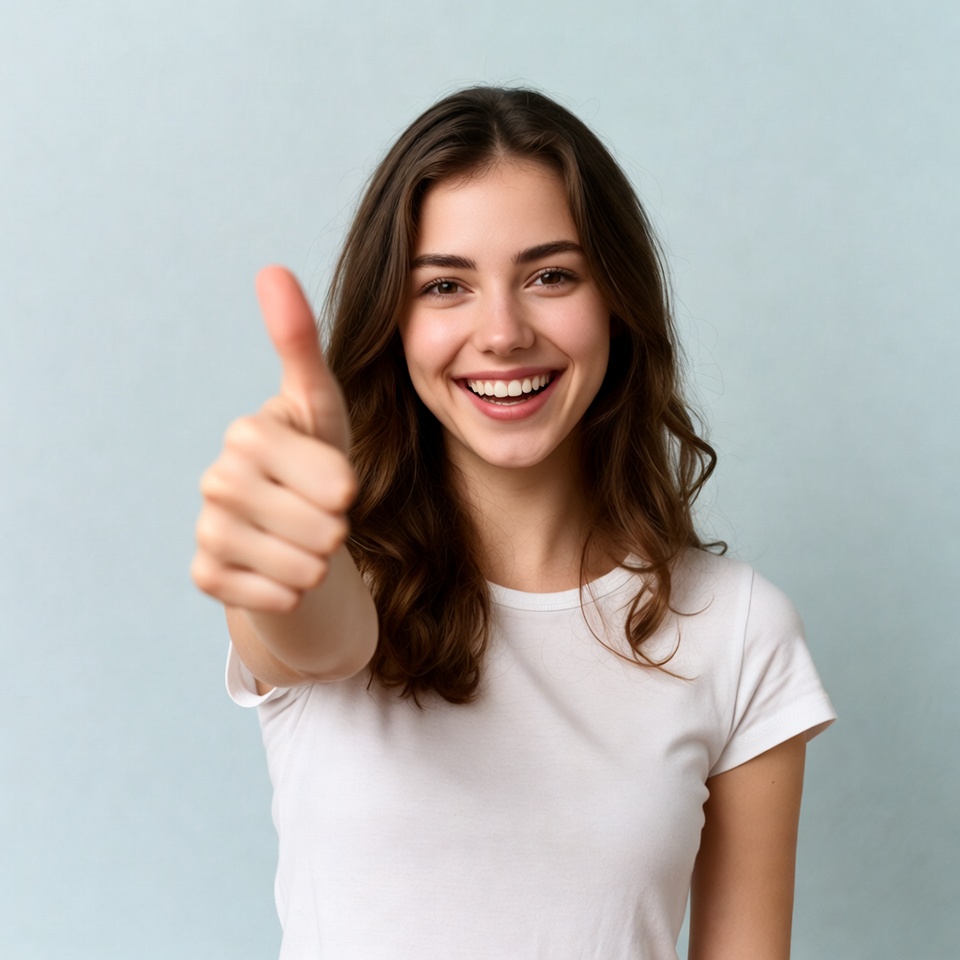 A woman stands against a light blue backdrop, smiling and raising her thumb in approval. She looks happy and confident in her pose.
